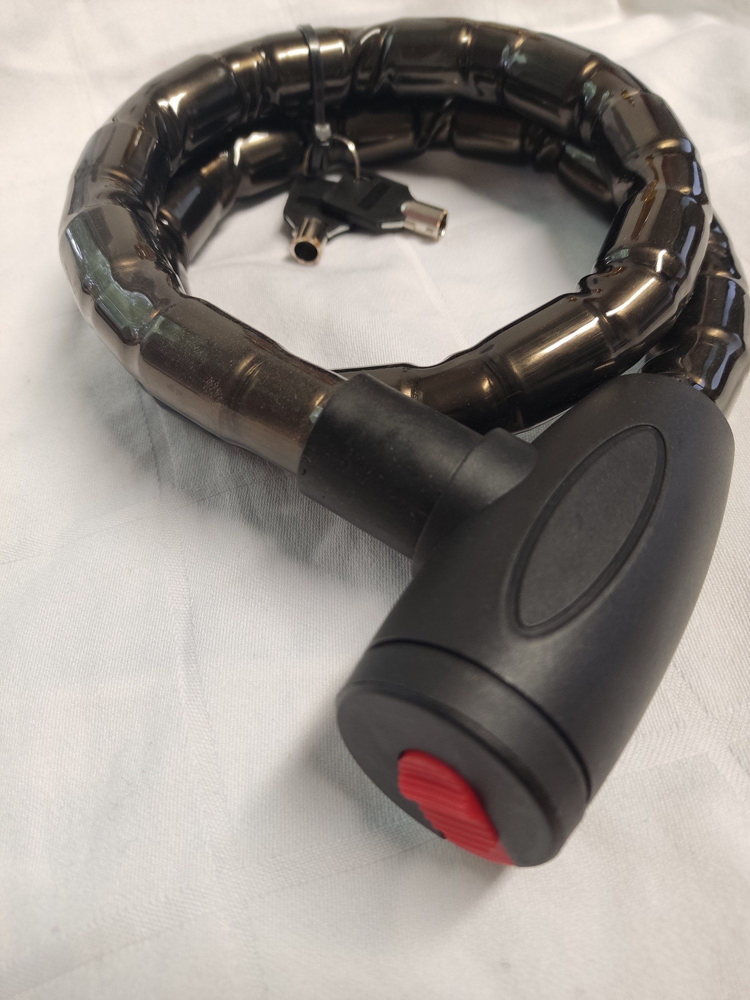 Die Kunststoffummantelung schützt die Lackoberfläche vor Kratzern und anderen Beschädigungen. In den einzelnen Gliedern ist ein ca. 22mm starkes Stahlkabel eingearbeitet. Der Zylinder besitzt eine integrierte Staubschutzkappe.